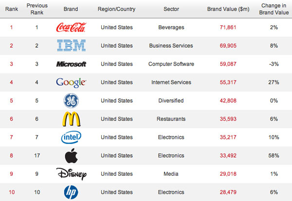 Позиции по результатам 2011 годаВ нынешнем году первая пятерка рейтинга оказалась во власти компаний, которые относятся к сфере высоких технологий. Старые эффективные бренды начали уступать компаниям с выдающимися маркетинговыми стратегиями. И Apple, и Google — это те компании, чья продукция определяет не только предпочтения и вкусы, но и образ жизни, стиль поведения и общения потребителей.