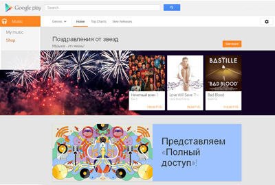 Google Play Music — музыкальный магазин, в котором можно купить миллионы треков 18 крупнейших музыкальных лейблов. Месячная подписка на Google Play Music будет стоить 189 рублей или 169 рублей для тех, кто подпишется на продукт в первые полтора месяца.