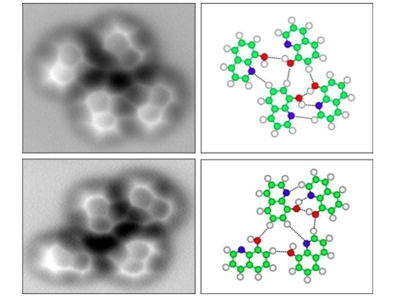 Ученые из Народного университета Китая и Национального центра нанонауки и технологии использовали в качестве объекта наблюдения вещество 8-оксихинолин (C9H7NO), нанесенное на медную поверхность. Структурная формула молекулы этого вещества представляет собой два бензольных кольца, в одном из которых атом углерода замещен азотом, а к другому присоединена гидроксильная группа (-ОН). Применив атомно-силовой микроскоп, исследователи получили изображения водородных связей между атомами водорода в гидроксильных группах и атомами кислорода в аналогичных группах соседних молекул.