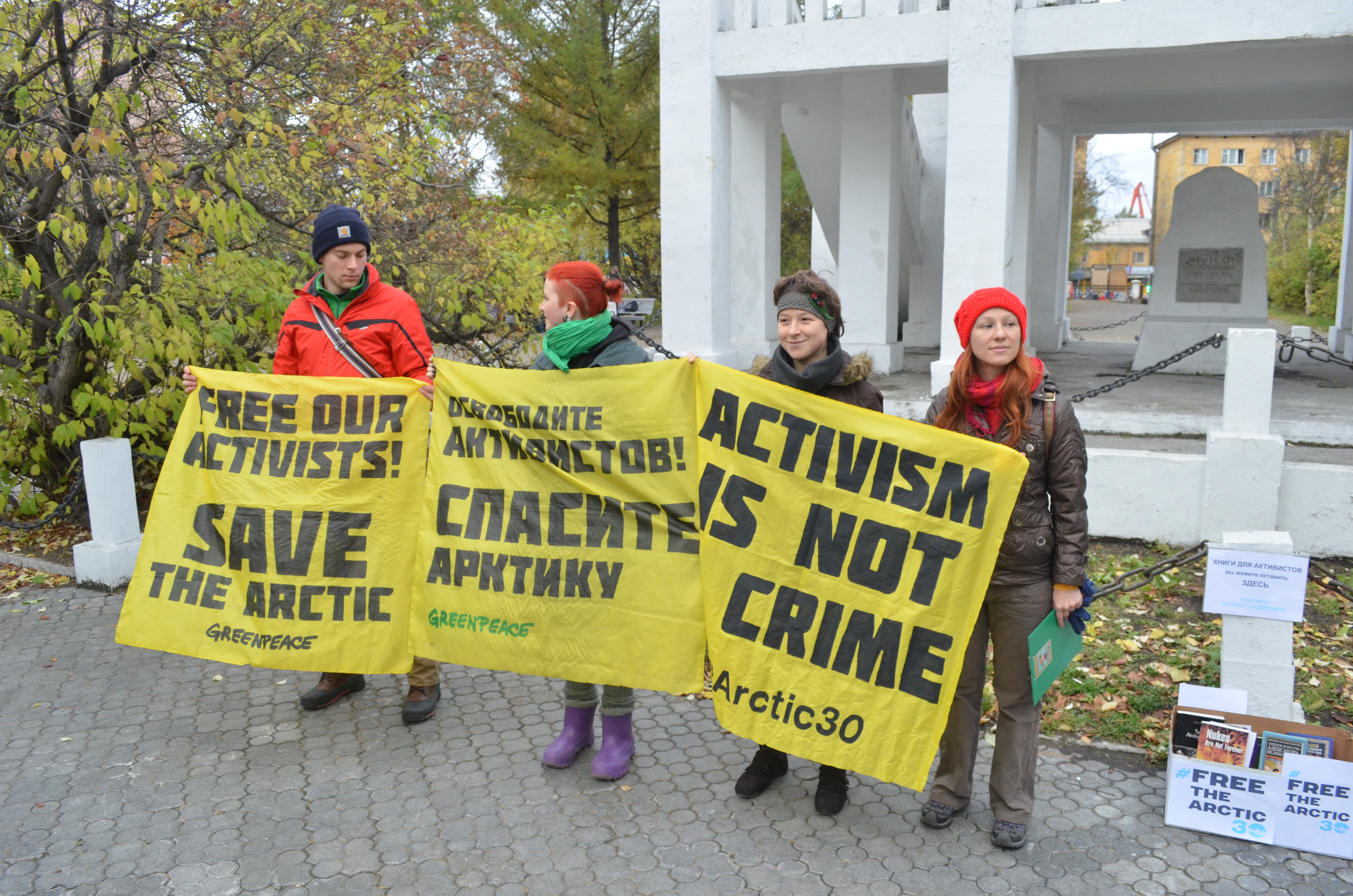 Экологи намерены продолжать акции протеста у российских дипломатических представительств. Небольшой пикет прошел 5 октября и в Мурманске. Журналист Максим Жаравин рассказал РС, что акцию организовала местная организация "Природа и молодежь". Они собирали иностранную литературу для задержанных, записки с пожеланиями и выступали за то, чтобы активистов "Гринпис" освободили. Журналистов было больше, чем самих организаторов, простые прохожие останавливались на несколько минут, потом уходили.