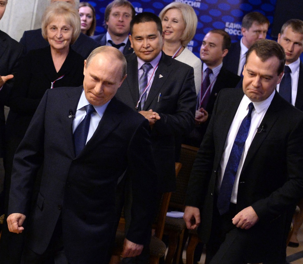 Президент отвечал на вопросы в излюбленном формате «прямой линии» с народом. Сидевший рядом Дмитрий Медведев изредка брал микрофон, добавляя реплики, начинающиеся с фразы: «Как справедливо сказал Владимир Владимирович…»