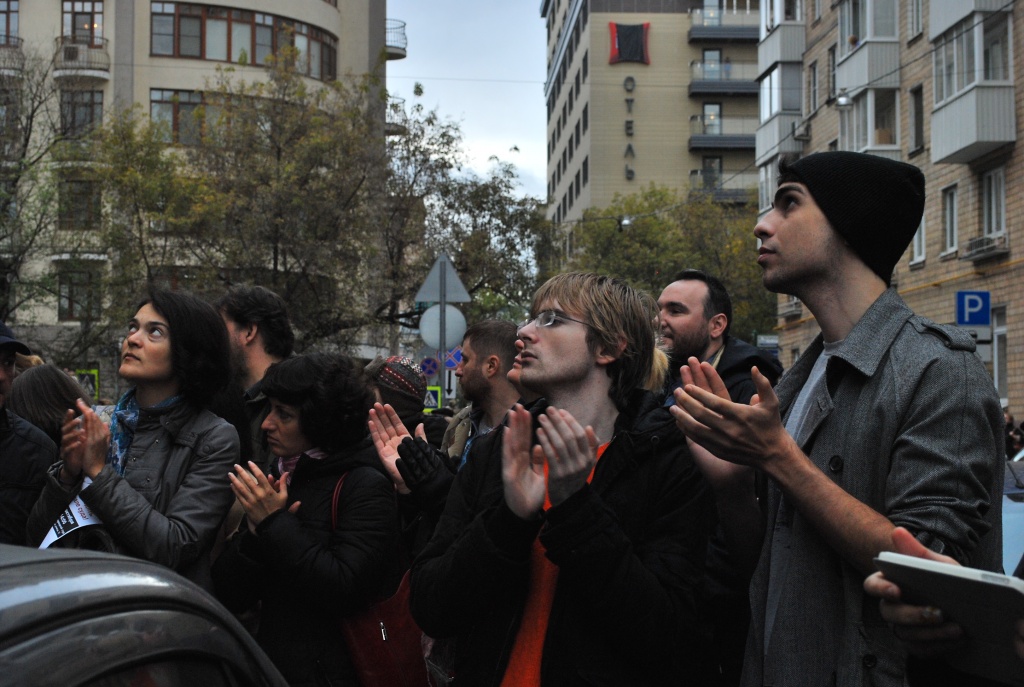 Из зала через твиттер поступали новости о том, что говорит судья. Люди на улице стали кричать «Позор!» - и ОМОН начал задержания. Выдергивали по одному из толпы и сажали в припаркованный рядом автозак. В первую секунду люди не могли понять, что происходит, но когда повели второго задержанного, улица взревела, скандируя уже все лозунги прошедших митингов. Судья читала приговор чуть меньше часа, и все это время на улице задерживали людей. Понять логику ОМОНовцев трудно, но, судя по всему, брали просто тех, у кого голос громче.