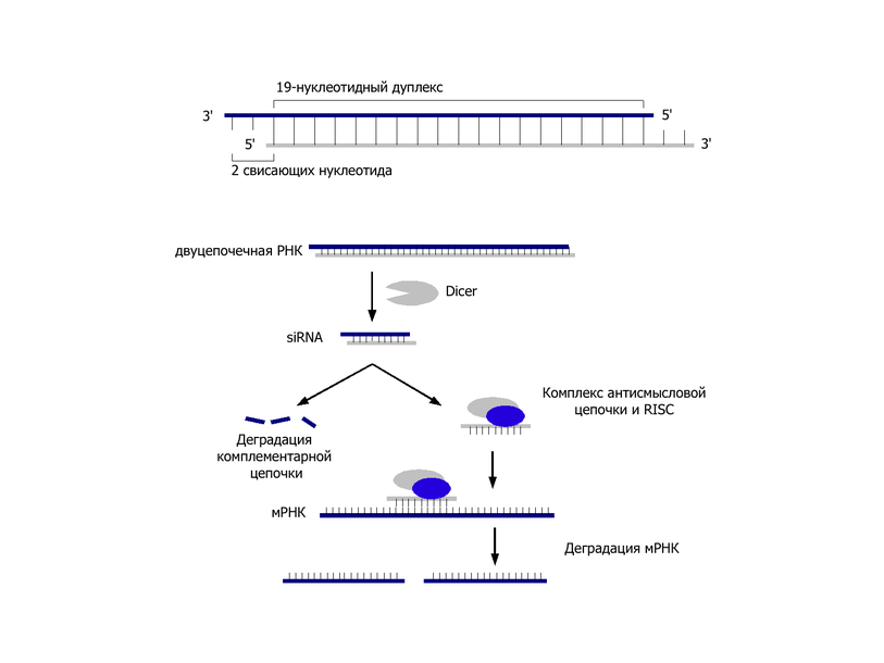 Термин РНК-интерференция описывает два процесса в клетках, которые имеют разную функцию, но объединены общим механизмом и конкретными белками, этот механизм реализующими. Белок Dicer, первым вступающий в игру, разрезает двухцепочечные РНК. Откуда берутся эти РНК? Некоторые из них синтезирует сама клетка. Они получили название малые интерферирующие РНК. После ряда превращений эти РНК будут по принципу комплементарности взаимодействовать с матричными РНК и регулировать активность генов этой клетки. За описание механизма такой РНК-интерференции в 2006 году ученые из США Эндрю Файер и Крейг Мелло получили Нобелевскую премию в области физиологии и медицины. Об этом явлении уже рассказывалось в ProScience.