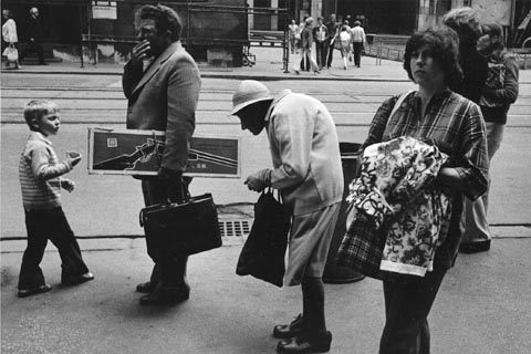 – Это сидячий протест. У них на пиджаках есть маленькие значки в виде триколора. Они молча сидят рядом с танком, потому что не могут вести диалог с танкистом. И это тоже хорошо передает характер Остравы. Это молчаливый город, в отличие от Праги, где люди вели бурные дискуссии с офицерами. В Остраве протест был демонстрацией беззащитности. Люди сидели, как садятся в знак протеста буддийские монахи. А рядом с этими сидящими – огромный танк, который может их всех раздавить. Вот такие переходные моменты меня интересуют – там, где что-то заканчивается и начинается что-то новое. Для фотографии это имеет решающее значение. Но важно, чтобы на снимке были второстепенные люди. Это значит, что для меня, например, период "нормализации" – это стоящие в ряд пустые трамваи, вокруг которых люди идут на первомайскую демонстрацию. Им приходится переступать через горы мусора, но у них хорошее настроение, рядом играет музыка. И это мой портрет "нормализации". Что люди радуются даже встрече на каких-то кучах строительного мусора недостроенной дороги. И все это – часть их каждодневной жизни.
