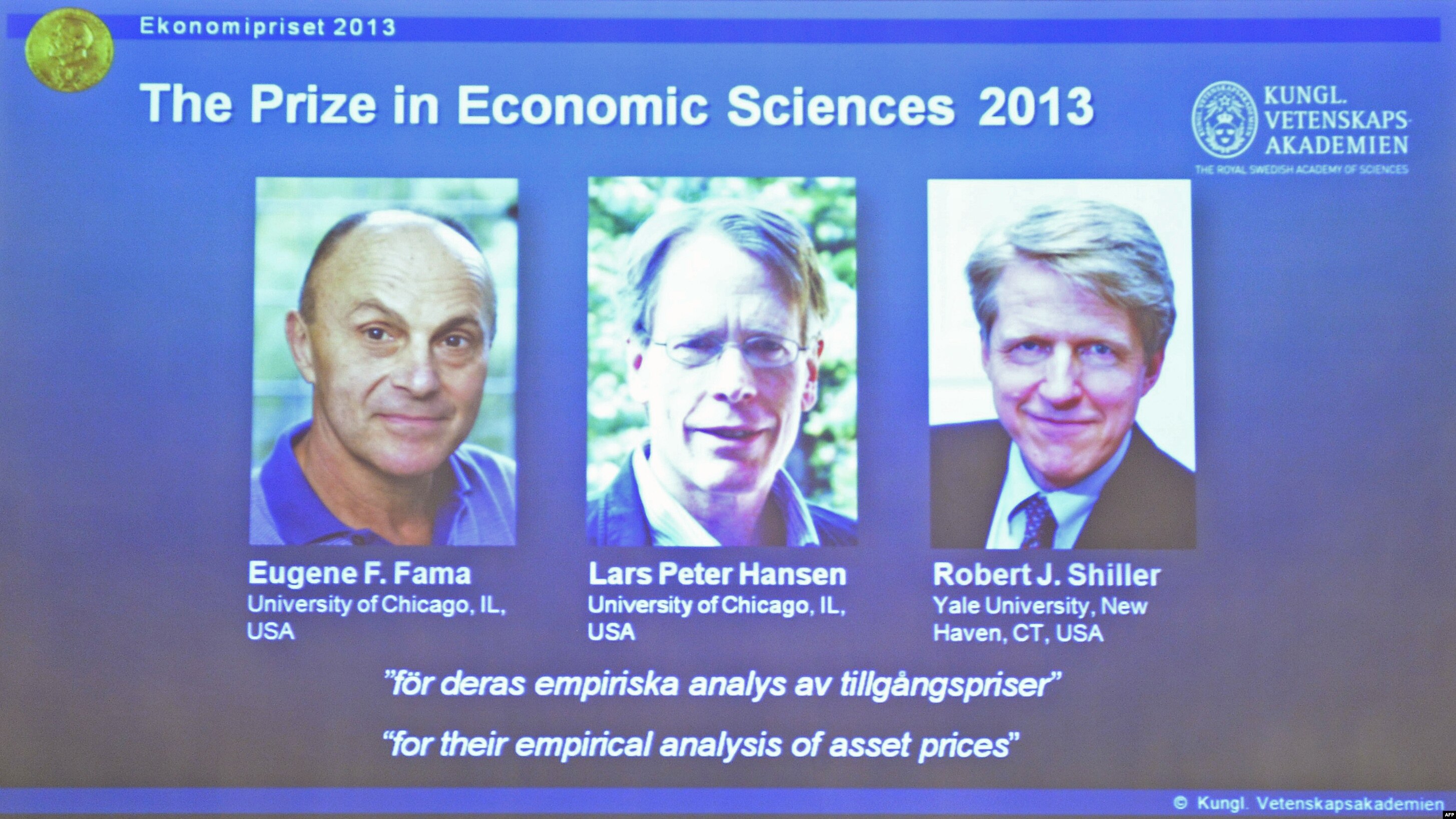 Юджин Фама и Ларс Питер Хансен – профессора университета в Чикаго, Роберт Шиллер – профессор Йельского университета.
