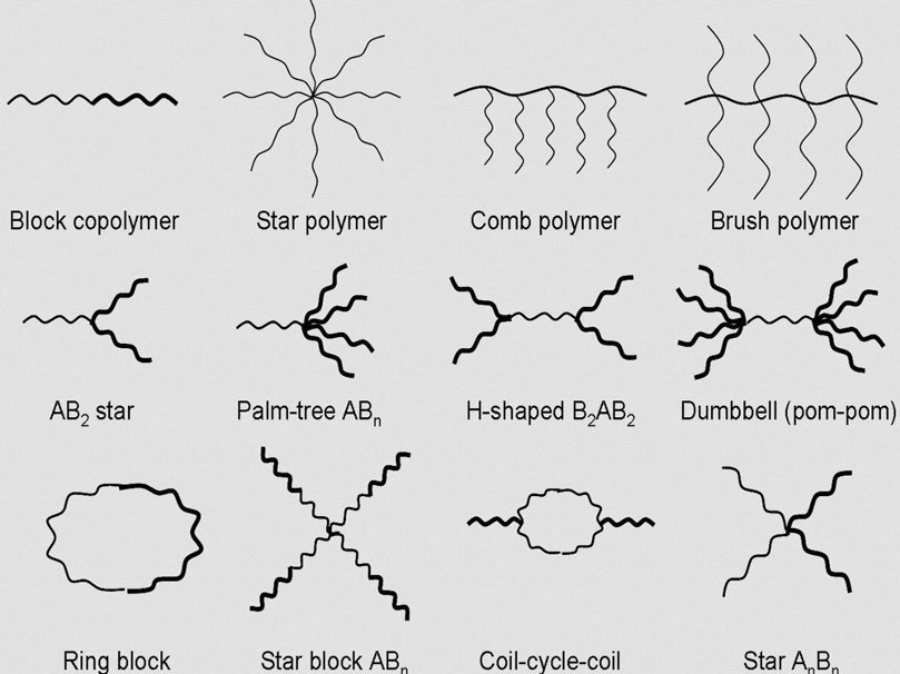 Такая самоорганизация возникает, например, в материалах, которые состоят из молекул блок-сополимеров. Блок-сополимер – это разные полимерные цепочки, соединенные между собой в одну при помощи ковалентной химической связи. В простейшем случае блок-сополимер объединяет две разные цепочки, но их может быть и больше, форма их соединения может быть самой разнообразной. Если мы возьмем блок-сополимер, две компоненты которого стремятся отклониться друг от друга (опять-таки за счет ван-дер-ваальсового взаимодействия), то полностью расслоиться они не смогут, ведь компоненты молекулы соединены ковалентной связью. Однако это отталкивание приведет к тому, что цепочки макромолекул сориентируются в пространстве, в результате в материале возникнет структура. В зависимости от относительной длины двух компонентов блок-сополимера это могут быть сферы из одного компонента, окруженные другим, или цилиндры, или слои и так далее. Поэтому, просто синтезируя блок-сополимерные макромолекулы с разным соотношением длин, можно проводить дизайн полимерных наноструктур.