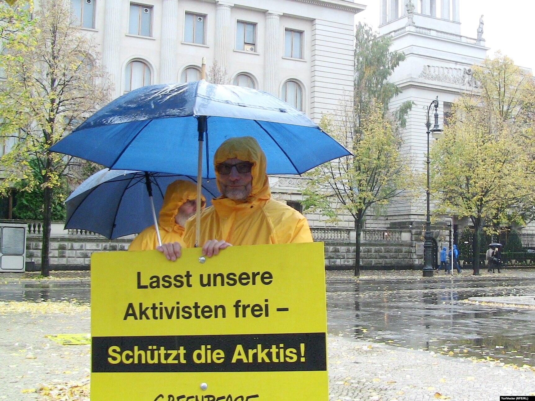 Напротив посольства на бульваре Унтер ден Линден несколько растяжек, на которых на разных языках написан один простой текст: "Освободите наших активистов. Спасите Арктику". У растяжек дежурят активисты в желтых куртках-дождевиках с надписью Greenpeace. Они раздают прохожим проспекты с информацией об инциденте и почтовые открытки с текстом, адресованным послу России в Германии Владимиру Гринину. Там, в частности, говорится: