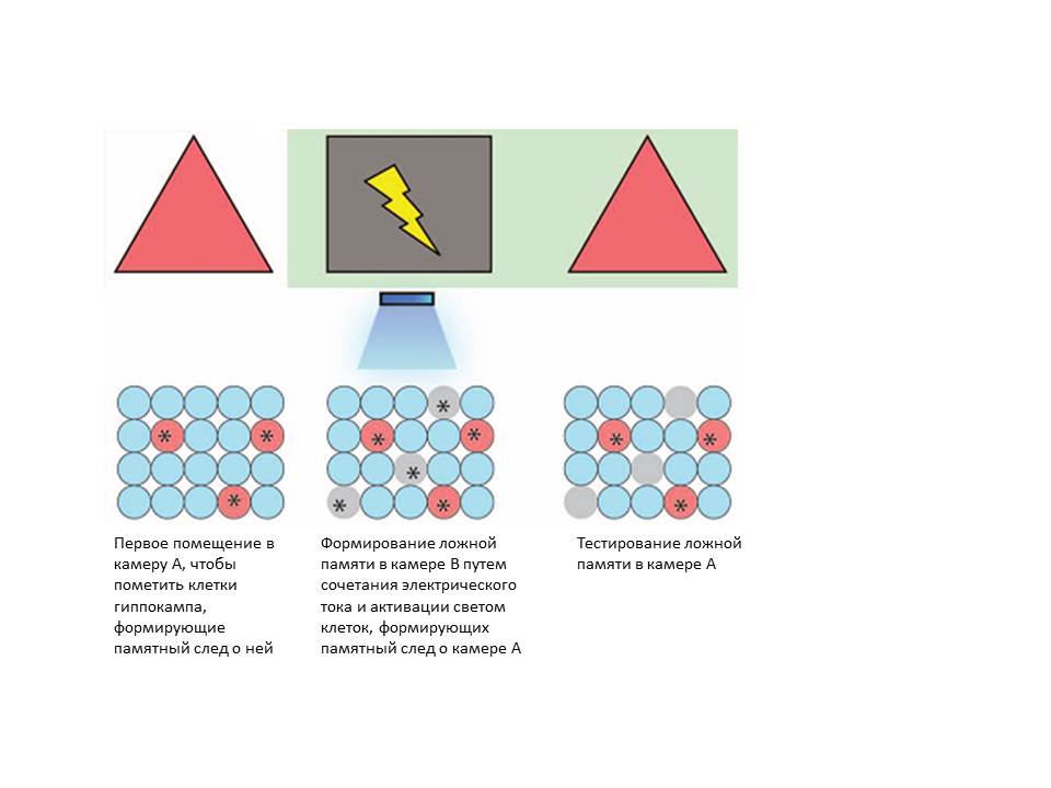 Схема эксперимента: красный треугольник – камера А, серый квадрат – камера B. Круги снизу – клетки гиппокампа, красным цветом отмечены клетки, хранящие памятный след о камере А, а серым – о камере B. Молнией обозначен электрический ток Вначале животных помещали в незнакомую камеру A, мыши обследовали её, в нейронах активировался ген с-fos, и клетки гиппокампа, связанные именно с этой камерой, оказались помечены светочувствительным белком. На следующий день, животных помещали в другую камеру B, значительно отличавшуюся от камеры А. Мышам подавали слабый электрический ток и одновременно освещали помеченные клетки гиппокампа, обращаясь таким образом к памятному следу о камере А. Когда на третий день животных снова посадили в камеру А, мыши боялись этой камеры, замирая в ней, хотя ничего страшного в ней никогда не происходило. Таким образом, исследователи сформировали у мышей ложную память. Более того, оказалось, что ложная память отчасти вытесняет истинную: при тестировании в камере B животные также боялись и замирали, но существенно меньше, чем в камере А.