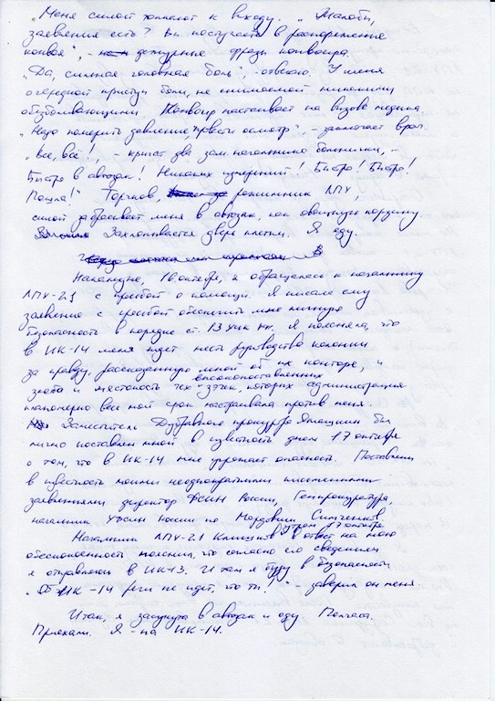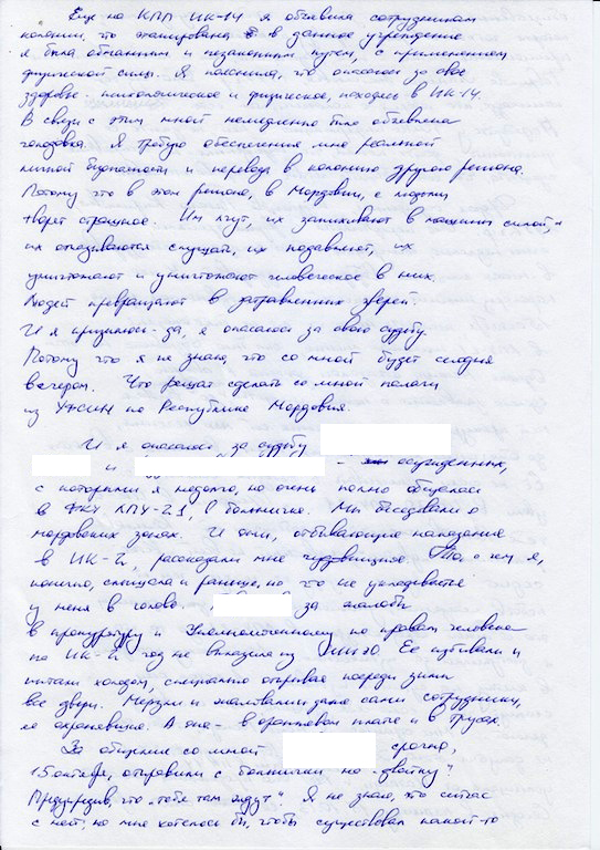 Еще на КПП ИК-14 я объявила сотрудникам колонии, что этапирована в данное учреждение я была обманным и незаконным путем, с применением физической силы. Я пояснила, что опасаюсь за свое здоровье, психологическое и физическое, находясь в ИК-14. В связи с этим мной немедленно была объявлена голодовка. Я требую обеспечения мне реальной личной безопасности и перевода в колонию другого региона. Потому что в этом регионе, в Мордовии, с людьми творят страшное. Им лгут, их запихивают в машины силой, и их отказываются слушать, их подавляют, их уничтожают и уничтожают человеческое в них. Людей превращают в затравленных зверей. И я признаюсь – да, я опасаюсь за свою судьбу. Потому что я не знаю, что со мной будет сегодня вечером. Что решат сделать со мной палачи из УФСИН по Республике Мордовия. И я опасаюсь за судьбу <…> осужденных, с которыми я недолго, но очень полно общалась в ЛПУ-21, в больничке. Мы беседовали о Мордовских зонах. И они, отбывающие наказание в ИК-2, рассказали мне чудовищное. То, о чем я, конечно, слышала и раньше, но что не укладывается у меня в голове. <…>за жалобы в прокуратуру и Уполномоченному по правам человека на ИК-2 год не вылезала из ШИЗО. Ее избивали и пытали холодом, специально открывая посреди зимы все двери. Мерзли и жаловались даже сами сотрудники, ее охранявшие. А она – в оранжевом платье и в трусах. За общение со мной <…> срочно, 15 октября, отправили с больнички на «двойку». Предупредив, что «тебя там ждут». Я не знаю, что сейчас с ней, но мне хотелось бы, чтобы существовал какой-то