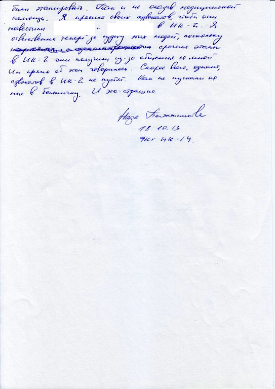 Сегодня, в пятницу, 18.10.13, ее опять должны были этапировать. Так и не оказав медицинской помощи. Я просила своих адвокатов, чтобы они навестили <…> и <…> в ИК-2. Я ответственна теперь за судьбу этих людей, поскольку срочные этапы в ИК-2 они получили из-за общения со мной. Им прямо об этом говорилось. Скорее всего, однако, адвокатов в ИК-2 не пустят. Как не пускали ко мне в больничку. И это – страшно»