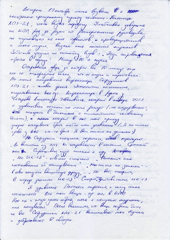 «Вечером 17 октября меня вызвали к контрольно-пропускному пункту колонии-больницы ЛПУ-21, чтобы выдать передачу. Улыбчивая девушка на КПП, раз за разом по распоряжению руководства не пускавшая ко мне адвокатов, правозащитников и моего мужа, выдала мне несколько журналов. Заботливо усадила на скамейку, выдав: «Жди сопровождения обратно в корпус». Минут 10 я ждала. Открывается дверь, за которой все 10 минут этих кто-то лихорадочно бегал, что-то кидал и переставлял. На меня направлена видеокамера. Сотрудников ЛПУ-21 человек десять. Заместители начальника, оперативники. Все тут. Видеокамера в руках у Четырёва Александра Ивановича, который в январе 2013 года с удовольствием написал на меня рапорт («не поздоровалась», находясь в больничке с сильнейшими головными болями), который в этот мой приезд упорно отказывался брать любые мои заявления («Я не имею права у вас что-то брать. Я вам ничего не должен»). Сотрудники спецчасти, торопясь, тараторят: «Вы выписаны из ЛПУ. Вы отправляетесь в колонию. Срочный этап». Спрашиваю, куда именно я еду. «На ИК-13», - отвечает спецчасть. - «Покажите мне постановление об этапировании». – «Мы ничего не должны, - в ответ получаю волшебную фразу, - но вот спорите. В наряде значится ИК-13». Смотрю, действительно, ИК-13. Я удивлена. Пытаюсь спросить, к чему такая поспешность. Все мои вещи - тут же, в КПП. Кто их и когда успел собрать пока я получала журналы, мне неизвестно. Позже выяснится, что вещи собраны были не все. Сотрудники ЛПУ-21 выпихивают мои сумки и забрасывают в автозак.