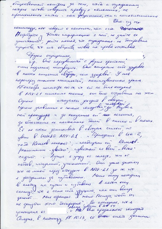 общественный контроль за тем, чтобы к осужденным, которые готовы говорить правду о колониях, не применялись пытки, как физические, так и психологические. <…> она из тех камикадзе, кто говорит о колонии, как есть. Потребуйте у ФСИН информацию о ней, не дайте ее уничтожить; дайте понять, что осужденные – не бесправные существа, что есть общество, готовое их права отстаивать. Другая осужденная, <…>, она передвигается с двумя тростями, очень медленно, согнувшись, она испортила себе здоровье в местах лишения свободы, села здоровой. У нее парапарез нижних конечностей, межпозвоночная грыжа. 15 октября, несмотря на то, что ей не было оказано в ЛПУ-21 никакого лечения, она была отправлена на этап. Однако <…> отказалась заходить в автозак, сделала заявление о начале голодовки, голодовки до вызова к ней прокурора и до оказания ей лечения, до облегчения ей постоянных болей в спине и ногах. Ее не стали запихивать в автозак силой, но увели в ШИЗО ЛПУ-21. «Приедешь в ИК-2, тебе Кемяев покажет», - пообещали ей. Кемяев – режимник «двойки, известный по всей «ветке» садист. «Лучше я умру от голода, чем от побоев, истязаний, унижений. Они уже сделали это со мной перед отъездом в ЛПУ-2 за то, что я заступилась за избиваемых. Меня саму посадили в клетку на сутки и избивали. А потом они скажут, что я сама себя удушила, как они всегда делают… Мне страшно. Я молю Господа, чтобы он не допустил этого беспредела», - вот последнее, что я услышала от <…>. Меня увезли в ИК-14. Она продолжает голодать.