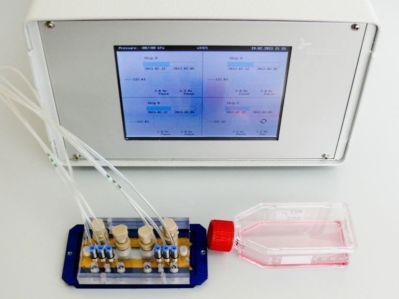 Например, чтобы создать дышащее легкое на чипе, которое имитировало бы механику альеолярно-капиллярной структуры легкого живого человека, клетки альвеолярного эпителия человека и микроваскулярные клетки эндотелия культивируются (выращиваются) в этом приборе, а вакуумные камеры-насосы на концах трубок создают физиологический поток жидкости и создают ритмические движения, аналогичные дыхательным. Этот принцип используется и при создании моделей других органов человеческого тела.