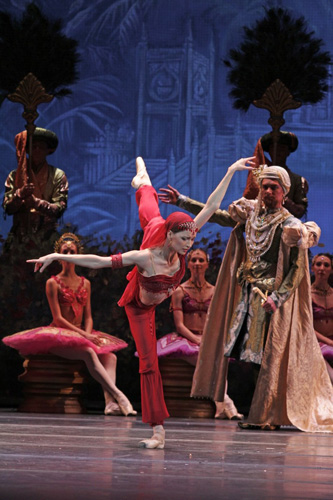© А. Клюшкина / МАМТ Понятно, что Музтеатру очень хотелось иметь «Баядерку» в репертуаре: сохранившиеся спектакли «золотого классического века» можно по пальцам пересчитать, а их присутствие в афише — знак принадлежности к высшей театральной лиге, попасть в которую так стремился в последние годы МАМТ с его амбициозной репертуарной политикой (купили лицензию на спектакли Ноймайера — и станцевали лучше, чем в Большом, купили лицензию на балеты Килиана — и опять победили в соревновании со старшим коллегой, отлично станцевали «Майерлинг» Макмиллана — и собираются в этом году поставить его же «Манон»). Понятно, что худруку балетной труппы Игорю Зеленскому не слишком хотелось работать с редакциями «Баядерки», уже представленными на отечественном рынке (в Большом идет версия Юрия Григоровича, в Мариинке — Пономарева—Чабукиани). Но почему бы тогда не заказать новую редакцию какому-нибудь знающему человеку? Очевидно, что самым эффектным ходом было бы возвращение на сцену реконструкции оригинального спектакля Петипа, осуществленной в 2002 году в Мариинке Сергеем Вихаревым и вследствие местных интриг исчезнувшей из репертуара, — но Музтеатру, боюсь, ее не потянуть в силу объективных причин: народу в труппе не хватит.