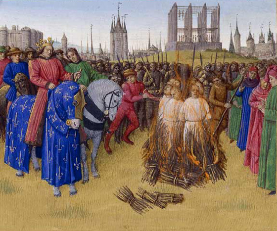 Bibliothèque nationale de France, Paris Казнь амальрикан (последователей Амори Шартрского). «Grandes Chroniques de France», 1455-1460, Jean Fouquet В 1179 году Третьим Латеранским собором впервые кодифицируется антисемитизм. Антисемитские законы с каждым годом усиливаются, пока евреи не изгоняются из Франции, Англии, потом Испании, а крещеные евреи не становятся главными жертвами инквизиции. Евреев вынуждают носить на одежде, как позднее при нацизме, отличительные знаки. Христиане, вступающие в половые отношения с евреями, приравниваются к зоофилам. Крестовые походы постепенно вырождаются в карательные операции против еретиков внутри самой Европы. Любопытно, что тот же Третий Латеранский собор принял постановление против еретиков, ростовщиков, евреев, мусульман и гомосексуалов. Вся компания, как видим, уже в сборе. Самые строгие законы были приняты в созданном крестоносцами Иерусалимском королевстве, где впервые в истории наказанием за гомосексуализм становится сожжение заживо на костре. И все это, конечно, увенчивается сотворением инквизиции и кровавым искоренением еретичества, колдовства и любых форм инакомыслия.