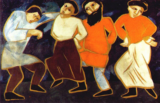 Наталия Гончарова, «Танцующие крестьяне», 1911 Свой Таити Гончарова нашла в Тульской губернии, в деревне Ладыжино, где она родилась в 1881 году. Правнучатая племянница «жены великого поэта» Натальи Николаевны Гончаровой все детство — до гимназии — провела в деревне. Видимо, там она и увидела своих евангелистов-крестьян и еще — архаичных «баб», раздражавших ревнителей традиционных ценностей не меньше, чем ее религиозные картины. Хотя, конечно, Гончарова много путешествовала по глубинной России, не ограничиваясь пределами Тульской губернии. В картины на библейские сюжеты Гончарова привнесла не только собственное прочтение священных текстов, но и религиозное мироощущение крестьянства, в котором сохранились следы язычества. Она окружила крестьянство ореолом святости — жест, быть может, наивный, но все же радикальный для своего времени.