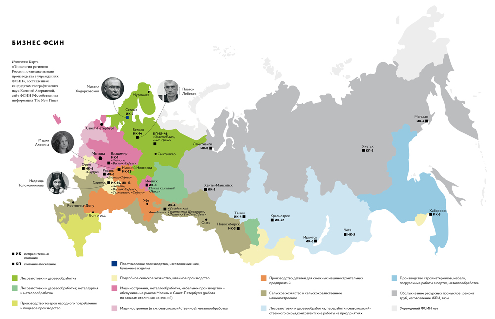 Компании «Восток-Сервис», «Сириус» и «Техноавиа», работающие на швейных производствах в зонах, «Золотой лес» и «Лестранс», покупающие лес у колоний Республики Коми, где условия труда такие же, как и на лесоповалах Кировской области, — это всего лишь небольшая часть российского бизнеса, которая использует рабский труд заключенных и считает это вполне нормальным. Мы попытались пролить свет на эту часть отечественной экономики и нанести на карту российских зон названия хотя бы некоторых фирм, которые не гнушаются такого бизнеса.
