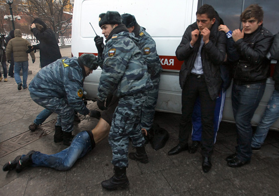 © Василий Максимов / Коммерсантъ Беспорядки на Манежной площади, 11 декабря 2010 г. Алексей Навальный: «Поднимите руки те, кто ретвитил “Спутник и Погром”. Тиша, я думаю, что вы тоже это делали».