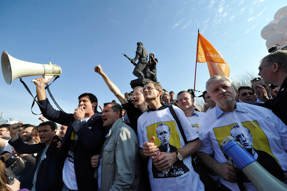 | Николай Левичев (в центре), Сергей Миронов (справа) на митинге в поддержку кандидата на пост астраханского мэра Олега Шеина (слева от Левичева), май 2012 г. |