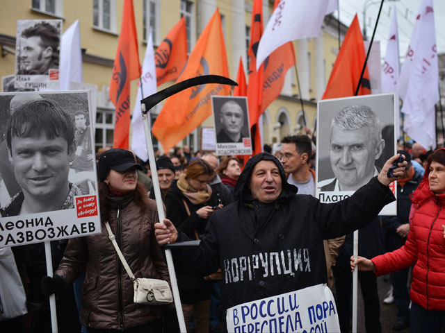 Участники "Марша в защиту политзаключенных" начали шествие по Петровскому бульвару, завершится марш у метро Тургеневская. Участники сформировали несколько колонн в зависимости от политических сил, которые они представляют. Во главе идут оппозиционеры с флагами движения "Солидарность" и портретами фигурантов "болотного дела", а также участниц Pussy Riot и Михаила Ходорковского. Участники марша скандируют лозунги "Свободу заложникам Путина!" и "Путин - вор!". В числе участников шествия Алексей Навальный, Петр Офицеров, Борис Немцов, Лев Пономарев.