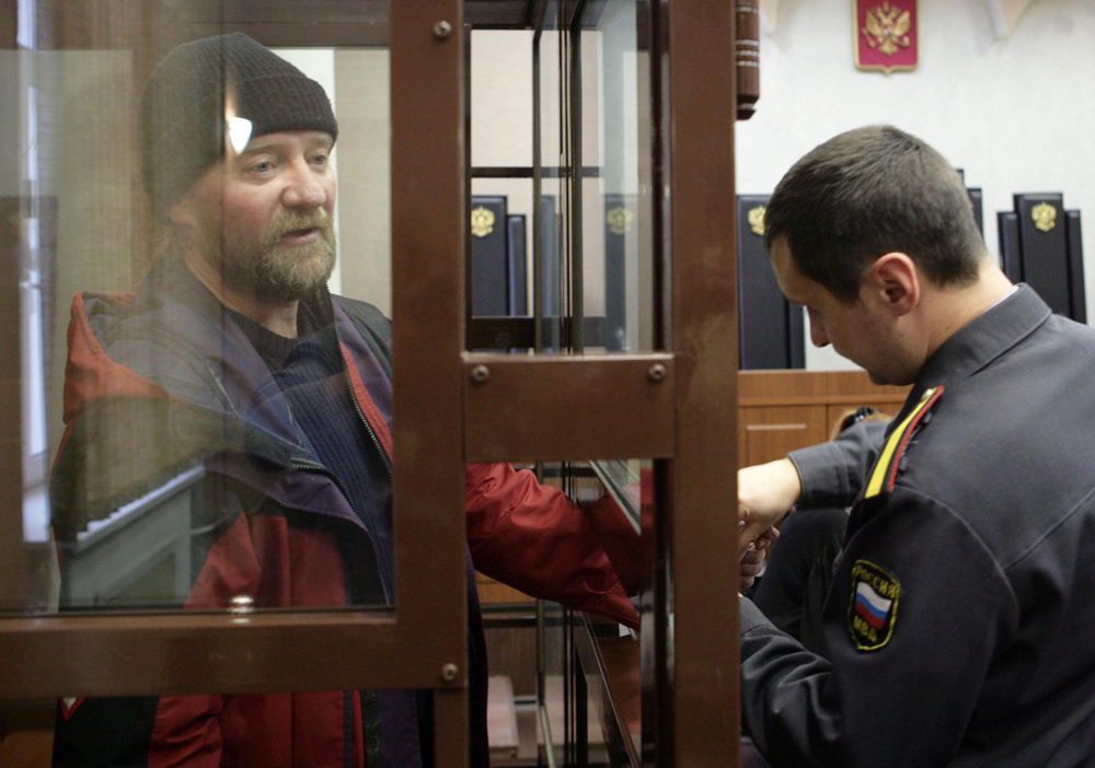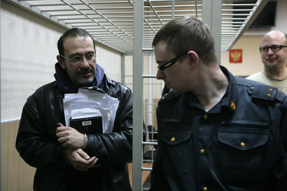 | Активист Greenpeace Дмитрий Литвинов (слева) в мурманском суде. 24 октября 2013 г. |