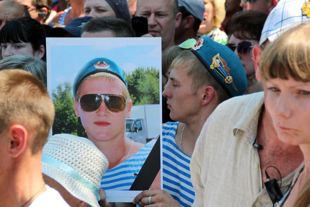 Десантник с портретом убитого Маржанова во время «народного схода» в г. Пугачеве. 9 июля 2013 г.
