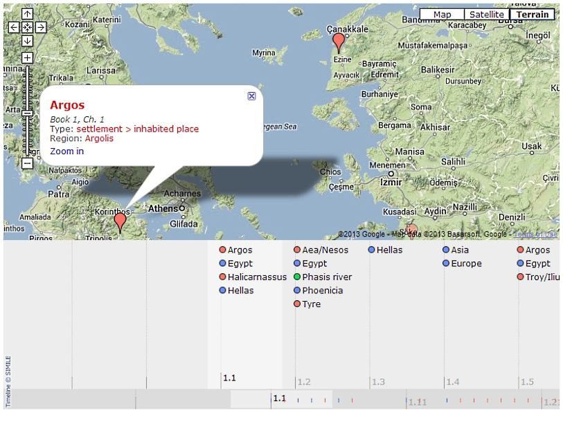 На сайте проекта создана геопространственная база данных текста «Истории» Геродота, которая позволяет искать географические места (поселения, территории или природные объекты), локализовать их на Google Earth и читать текст параллельно с картой Narrative TimeMap.