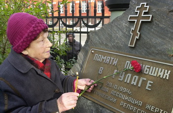 На первой фотографии: Россия, Белгород. 30 октября. Муза Медведева - дочь расстрелянного в 1937-м году священника у закладного камня памяти погибших в ГУЛАГе. Фотография ИТАР-ТАСС