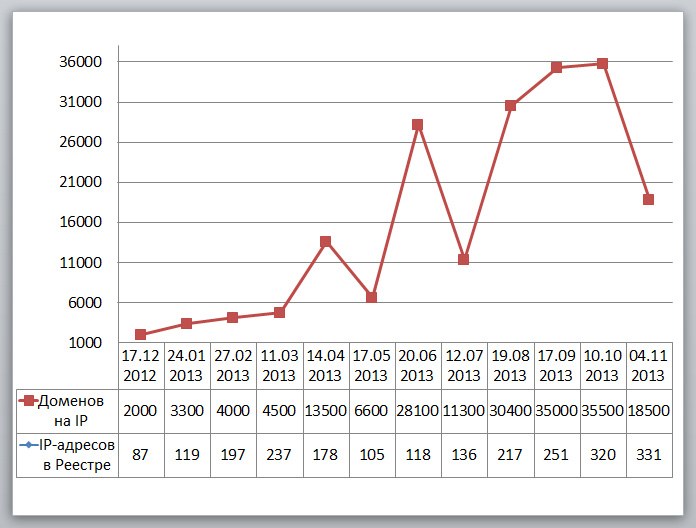 Постоянный мониторинг реестра запрещенных сайтов начался в декабре 2012 года, и первый же его результат показал вполне предсказуемые статистические данные: более 2000 добропорядочных сайтов подвергались блокировке неправомерно из-за того, что 87 IP-адресов были помещены в “черные списки”. Если перевести в процентное соотношение, получается, что из-за 4% сайтов, несущих некий запрещенный контент, доступ ограничивался для 96% других интернет-ресурсов.