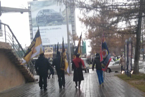 13:35 Группа молодых людей с имперскими знаменами постояла в Первомайском сквере с участниками хоровода и пошла к «Капиталу». По подземному переходу: не сообразили, что по пешеходному было бы эффектнее, передает корреспондент Тайги.инфо.
