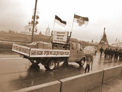 В центре колонны ехал грузовичок, на котором чёрным по жёлтому было написано: «Банк России – орудие ФРС США для грабежа России!», «Родись на Руси! Живи на Руси! Умри за Русь! Рубись там, где стоишь!»…