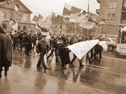 Ещё до начала митинга, во время движения колонны, после очередного порыва возле Ольгинского моста к моим ногам, в лужу, с шумом прилетело мокрое полотнище. Как будто птицу налету сбили. Я полотнище тут же поднял.
