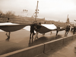 Еще человек десять с трудом удерживали огромный имперский флаг чуть поодаль. Ветер раздувал этот флаг, как парус. Дождь лил не переставая. Немногочисленные прохожие прыгали из лужи в лужу.
