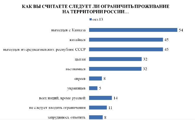 – В вашем исследовании вопрос ставился так: "Как вы считаете, следует ли ограничивать проживание на территории России?" Респонденты считают: "Ограничить" выходцев с Кавказа – 54 процента, китайцев – 45 процентов, выходцев из среднеазиатских республик СССР – 45 процентов, цыган – 32 процента, вьетнамцев – 32 процента, евреев – 8 процентов, украинцев – 5 процентов. Я обращу внимание на две цифры из вашего исследования, это экстремальные точки: "Ограничить проживание в России представителей всех наций, кроме русских" – 14 процентов, "Не следует вводить никаких ограничений" – всего 11 процентов. Эти тенденции как меняются на протяжении времени в ваших исследованиях?