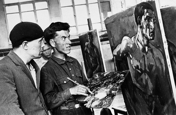 © В. Культин Фреска в Доме Стройбюро, нынешний вид Находку в Доме Стройбюро в полной мере можно считать сенсационной. Не только потому, что настенной живописи довоенного времени сохранилось очень мало, и не только из-за очевидности авторства: довоенные фотографии росписи сохранились у дочери одного из коммунаров, художника Василия Маслова (1905—1938, расстрелян). Сенсационная она потому, что найденный памятник известен по архивным материалам и ранее считался утраченным, так как, по неточным сведениям, роспись была сделана внутри другого здания комплекса — коммунарского клуба «Искра», сгоревшего в 1943-м.