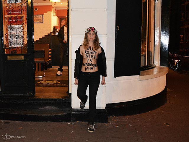 "Femen Нидерланды требует отменить позорную ошибку своей страны и отменить легальность голландской секс-индустрии. Femen требует ввести уголовную ответственность для клиента проституции и положить конец узакониванию сексуальной эксплуатации женщины! Нет проституции!" - призывают девушки.