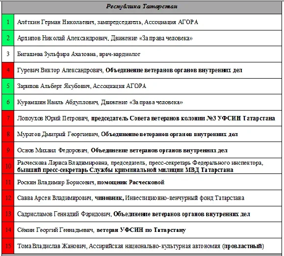 В Татарстане при формировании ОНК второго созыва семеро кандидатов представляли тесно сотрудничающие с МВД организации - «Объединение ветеранов боевых действий органов внутренних дел и внутренних войск Республики Татарстан», Татарскую республиканскую общественную организацию инвалидов войны в Афганистане и т.д. Тогда на смену недопущенному в новый состав председателю Казанского правозащитного центра Игорю Шолохову председателем ОНК была избрана экс-пресс-секретарь криминальной милиции Татарстана, член Общественного совета при УФСИН РТ, член Совета при президенте РТ по противодействию коррупции Лариса Расческова. Она же прошла и в новый состав ОНК. Сейчас Расческова возглавляет пресс-службу Главного федерального инспектора по Татарстану.