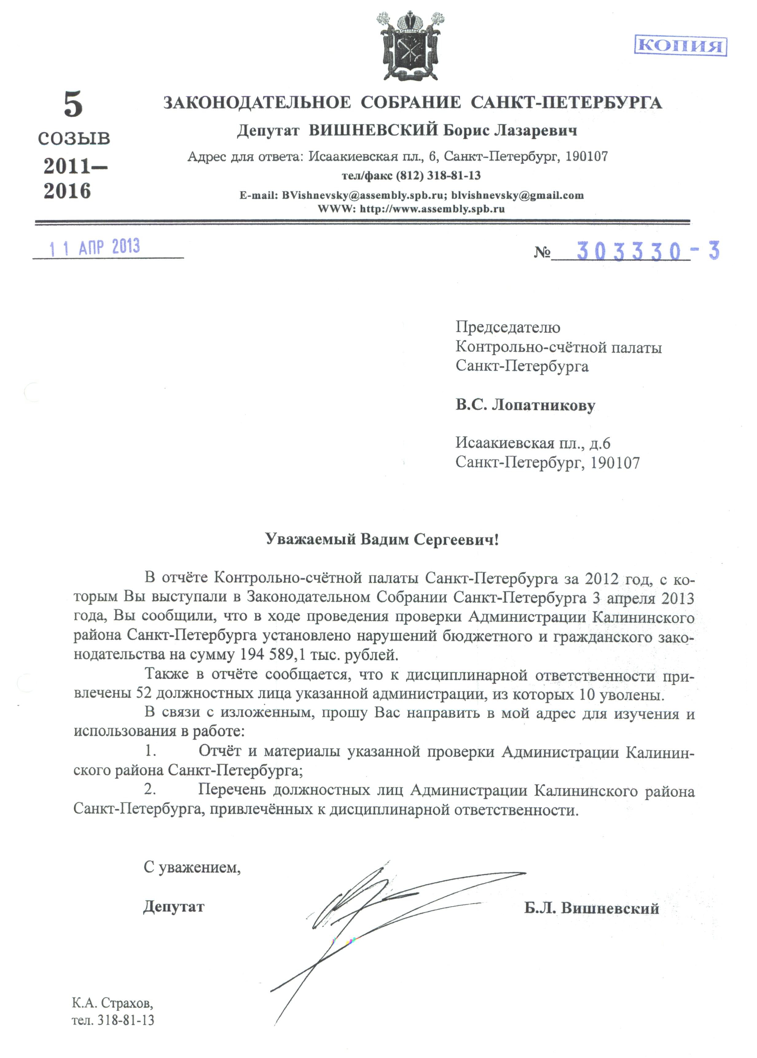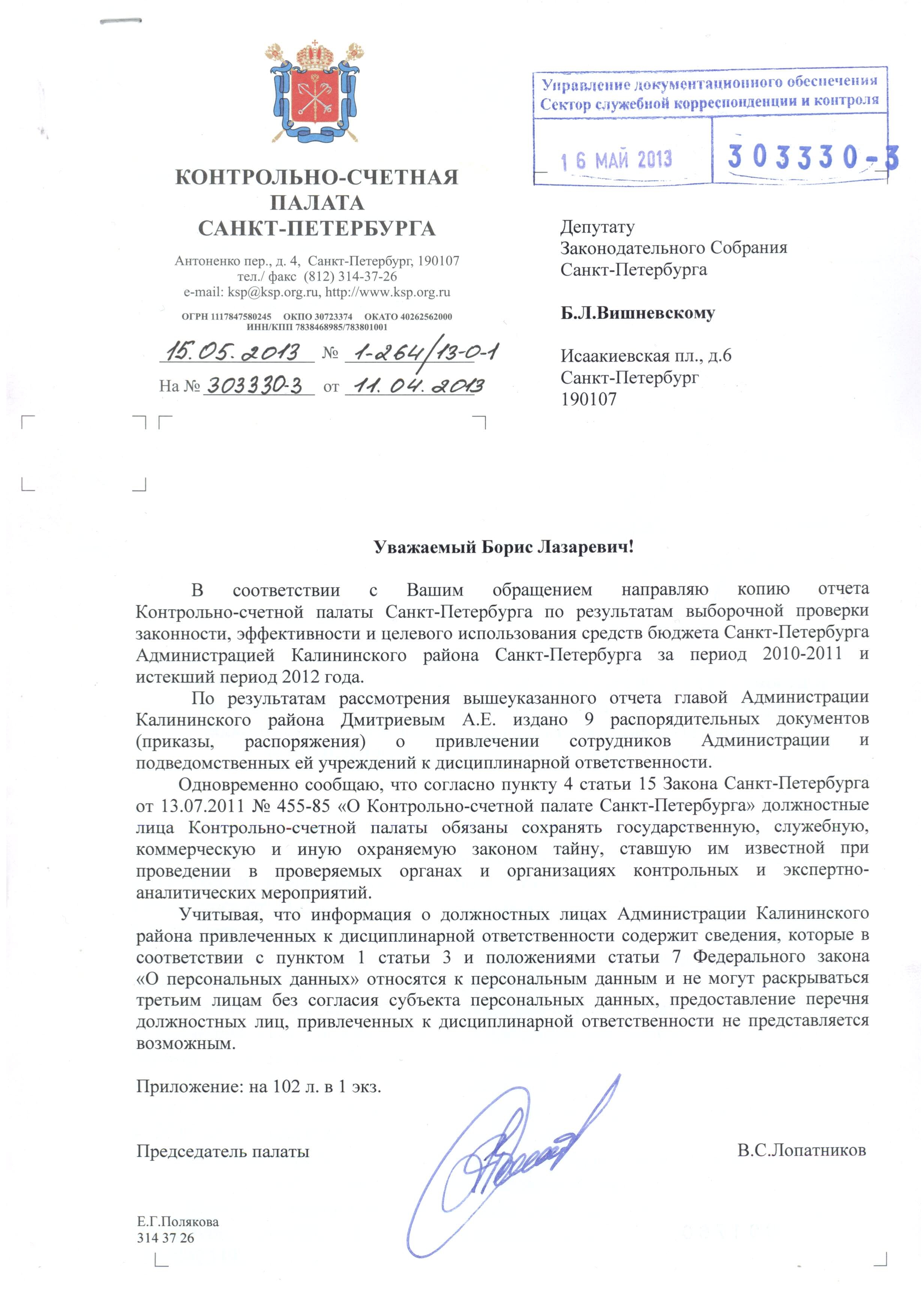 – в ходе проверки в Калининском районе Санкт-Петербурга установлено нарушений бюджетного и гражданского законодательства на сумму 194 589,1 тыс. рублей;