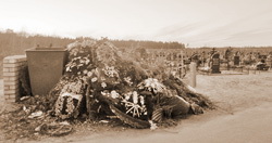 Его и сейчас нет между могилами. Мусорные кучи, куда свалены старые выцветшие венки, пластиковые букеты и стандартные кресты, аккуратно собраны вокруг контейнеров. Контейнеры при этом пусты.