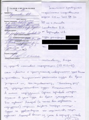 Заместителю руководителя межрайонного следственного отдела СУ по ЗАО ГСУ СК РФ по г. Москве Соловьевой Е.И. от Воронцова И.В. адрес регистрации <…> тел: <…>ЗаявлениеМне, Воронцову Илье Валентиновичу, вчера из средств массовой информации (18.11.2013) стало известно о преступлении, совершенном судьей Никишиной и приставами Никулинского районного суда во время заседания по так называемому «Болотному делу» под председательством судьи Никишиной. А именно: подсудимый Сергей Кривов потерял сознание в зале суда во время заседания. Его адвокат Макаров (а также все адвокаты и подсудимые) попросили вызвать «скорую помощь». Судья не удовлетворила это ходатайство, тогда адвокат Макаров вышел из зала в коридор, чтобы вызвать «скорую помощь» самостоятельно. Через несколько минут «скорая» приехала. По сообщению Натальи Мавлевич на своей странице в интернете по адресу: www.facebook.com приставы сказали врачам, что им нельзя войти в зал заседания для оказания медицинской помощи, поскольку там происходит процесс в этот момент. Врачи скорой стали стучаться в дверь, поскольку, как я понимаю, собирались выполнить свой служебный долг по оказанию медицинской помощи. Но в этот момент их в зал уже распорядилась не пустить сама председательствующая судья Никишина. Адвокаты попросили сделать перерыв в судебном заседании. На это судья сказала, что не видит для этого оснований, потому что «скорую помощь» вызвал не суд. Адвокат Макаров говорит: «Кривов без сознания». Судья: «Тишина в зале! Будем продолжать!» Конвойные подтверждают, что Кривов без сознания. Публика и все присутствующие в зале стали возмущаться препятствованию оказанию медицинской помощи человеку, находящемуся без сознания, со стороны судьи и приставов Никулинского суда. После этого судья Никишина распорядилась вывести зрителей из зала и продолжила заседание, так и не допустив врачей к подсудимому Сергею Кривовую.Прошу:провести проверку и возбудить уголовное дело в отношении судьи Никишиной, приставов Никулинского районного суда и других, возможно, соучаствовавших в совершении этого преступления: имеется ли состав статей 285, 286, а особенно 124 и 125 УК РФ? Кроме того, явно усматриваю нарушение международных обязательств РФ по подписанной нашей страной Европейской Конвенции о защите прав человека и основных свобод, а именно: права на жизнь, права на свободу и личную неприкосновеннось, права на справедливое судебное разбирательство. А также статей Конституции РФ, а именно: статьи 2, статьи 4 части 2, статьи 7 части 1, статьи 7 части 2, статьи 15 части 2 (особенно!), статьи 15 части 4, статьи 17 (особенно!), статьи 18, статьи 18 части 2, статьи 20 части 1, статьи 21 (обе части), статьи 22 части 1, статьи 24 части 2 (подсудимый Кривов не может добиться права на ознакомление с протоколами судебных заседаний в течение более чем 60 (шестидесяти) дней), статьи 41 части 1 и части 3 (особенно!), статьи 45 (обе части), статьи 46 части 1.кроме того, прошу предотвратить дальнейшее нарушение прав и свобод подсудимых по этому делу, а также предотвратить подобные нарушения в отношении других лиц, совершаемых в Никулинском районном суде должностными лицами. Поскольку, по более ранней информации из СМИ, такие нарушения имеют в Никулинском суде систематический характер.проверить, не происходит ли продолжение преступления сегодня, а именно в данный мом
