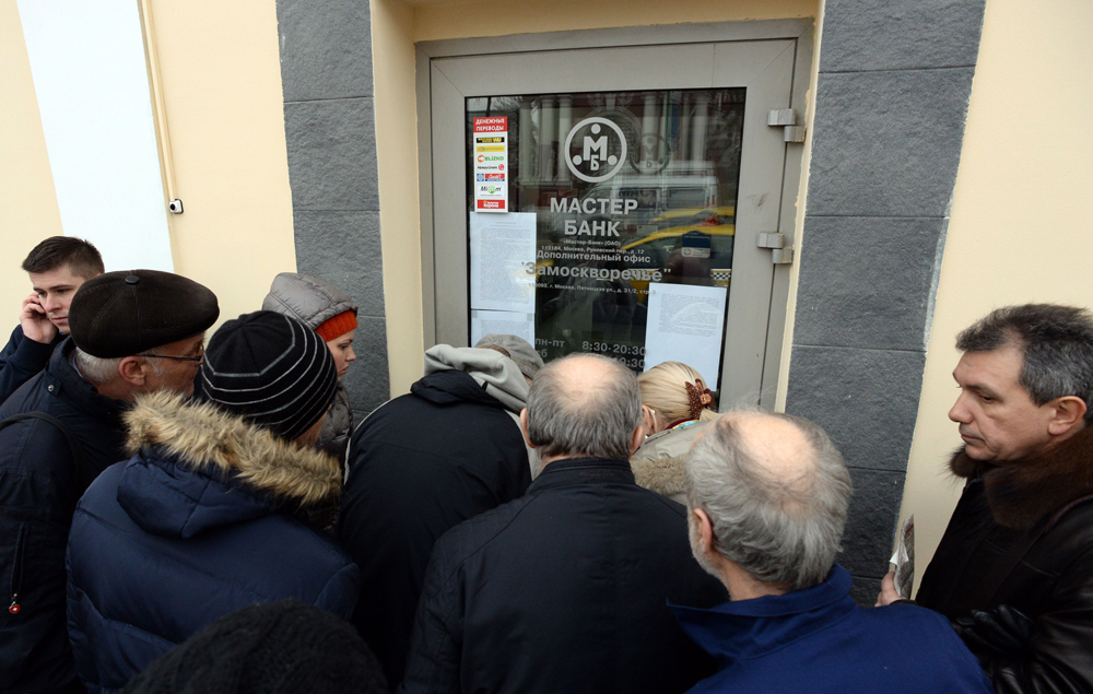 Вкладчики у закрытых дверей Мастер-Банка в день, когда Центральный банк отозвал у этой денежной прачечной лицензию. Москва, 20 ноября 2013 г.