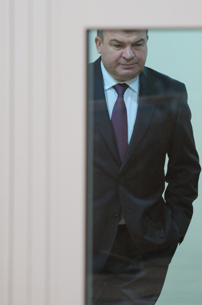 Министр обороны РФ Анатолий Сердюков после участия в пленарном заседании Госдумы РФ 22 октября 2012 года