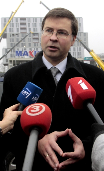 Премьер-министр Латвии Валдис Домбровскис отвечает на вопросы журналистов на территории торгового центра Maxima 22 ноября 2013 года