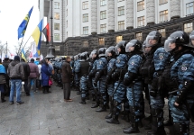 В понедельник столкновения между сторонниками евроинтеграции Украины и сотрудниками спецподразделений милиции возобновились у здания правительства. Участники бессрочной акции протеста пытались блокировать здание. Столкновения продолжались около получаса. Чтобы оттеснить протестующих от здания кабинета министров, милиция применила дубинки и слезоточивый газ. Протестующие в свою очередь скрывали шлемы с бойцов спецподразделения "Беркут" и бросали в них различные предметы.