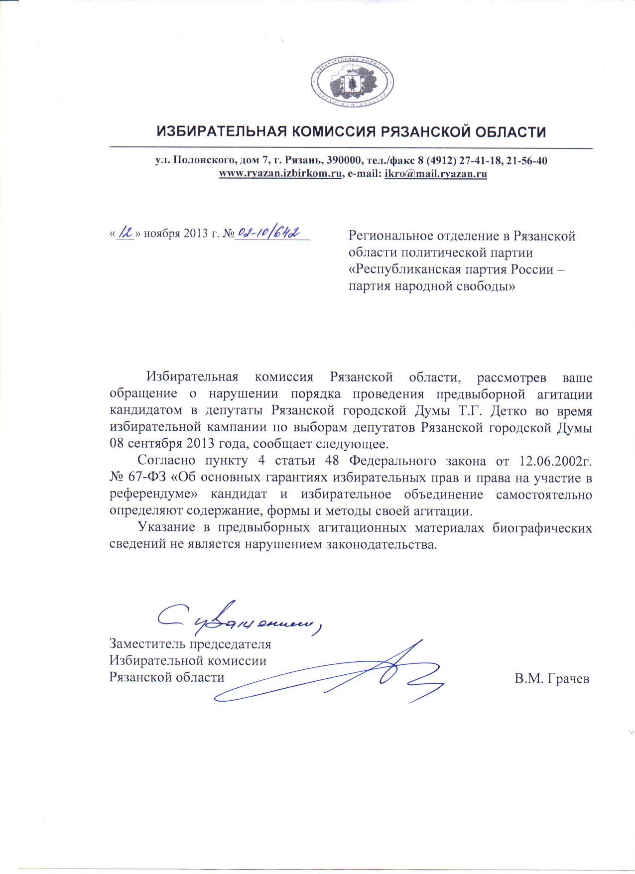 Кому лень идти по ссылкам, коротко суть. Партия РПР-ПАРНАС поймала «партию жуликов и воров» на мошенничестве, жульничестве в ходе последней предвыборной кампании в гордуму Рязани. Мало того, что эти «жулики и воры» поставили во главе избирательной комиссии города родственницу главного городского (и областного) «едораса» Аркаши Фомина, так они во многих случаях еще и усилили контроль за работой участковых комиссий (УИКов) тем, что назначили в их состав непосредственных подчиненных кандидатов в депутаты от «Единой России». Так было, в частности, в 69-й школе в Канищево, где во всех четырех (!) расположенных там УИКах работали подчиненные кандидата (тогда еще) в депутаты, директора вышеназванной школы Татьяны Детко. Законом подобные трюки запрещены. Вот мы и высказали свои сомнения еще до дня голосования 8 сентября прокуратуре и областному избиркому. И получили ответ, что, мол, никакой Татьяна Детко не директор, потому что ее уволили аж 17 (семнадцатого!) июля. И все бы ничего, да обнаружилась брошюрка с жизнеописанием Детко, изданная «партией жуликов и воров» 27 (двадцать седьмого!) июля, из которой можно сделать однозначный вывод о том, что именно Детко и является (если хотите, продолжает оставаться) директором. Следовательно, закон нарушен. Мы, конечно, опять в областной избирком с вопросами. А нам, конечно, оттуда: «Идите вы на…» Ну, это если простыми словами изложить реальный смысл ответа за подписью гражданина Владимира Грачева.