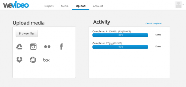 - После этого следует добавить материалы, над которыми вы планируете работать. Вы можете загружать ролики, картинки и аудио со своего компьютера, импортировать их из Facebook или других облачных сервисов (Google Drive, Dropbox, Box, Picasa, Flickr и Instagram).