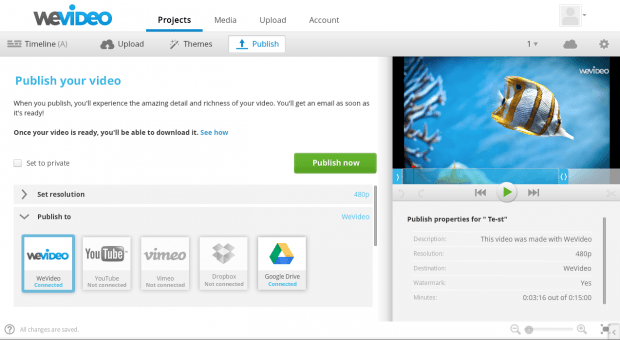 Для сохранения результатов своей работы вам следует нажать кнопку Publish, указать требуемое разрешение и затем выбрать «облачное» хранилище, в котором будет сохранен файл.