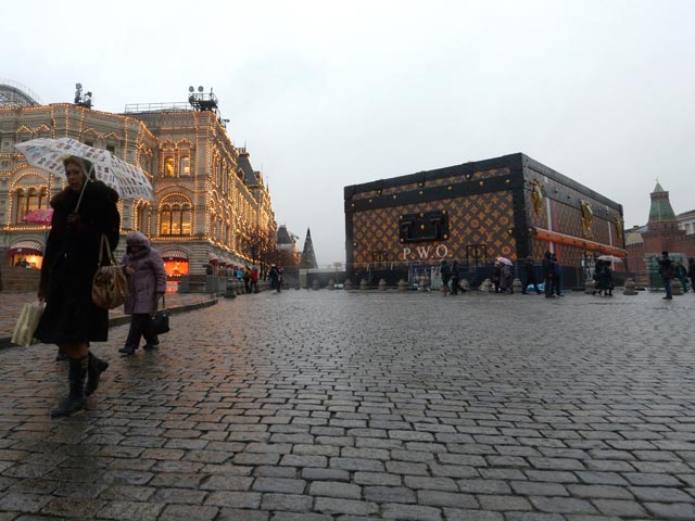 Павильон в виде огромного чемодана Louis Vuitton был воздвигнут на Красной площади накануне выставки этой французской фирмы, приуроченной к 120-летию московского ГУМа. Появление "иностранного сундука" на главной площади страны вызвало возмущение ряда блоггеров, политиков и общественных деятелей.