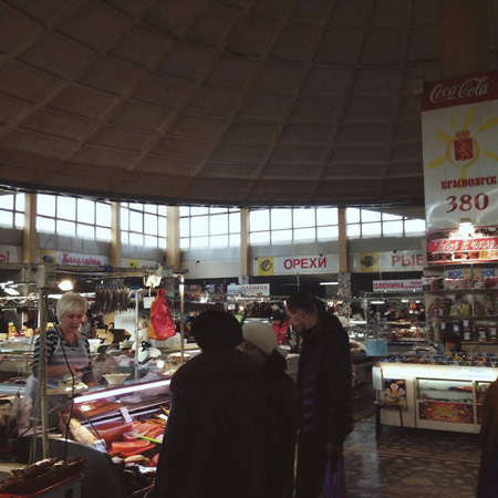 © Ангелина Бурлюк Мясные ряды самые длинные. Руки торговцев поднимают красные говяжьи туши, которые податливо поворачиваются то правым боком, то левым. На железных крюках болтаются поросята и кролики.