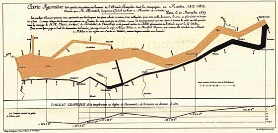 commons.wikimedia.org Джон Сноу. Карта распространения холеры по Лондону Следующая важная и крайне известная работа была создана всего двенадцатью годами позже французом Жозефом Минаром. Он нарисовал карту движения и возвращения из похода войск Наполеона. Тут на реальный географический скелет (слева — Париж, справа — Москва) нанесена линия, толщиной равная количеству войск, от которой отпочковываются какие-то куски армий, потом снова с ней сливаются, и так редеющая струйка проходит через все известные нам поля битв, доползает до Москвы и затем, черная вместо позитивного розовенького цвета, истончающаяся, возвращается в Париж. Это очень яркая работа, потому что здесь несколько пересекающихся слоев информации. С одной стороны — это карта движения войск. Ты видишь, как они физически двигаются, в каждом миллиметре — тысячи солдат сделали один шаг вправо, — на Москву. Ты видишь, какие битвы уменьшают их количество и насколько. Ломается линия, и ты чувствуешь, какое решение было принято. Видишь, как они возвращаются обратно, сопереживаешь и понимаешь все про эту войну. Это идеально описывающая всю войну графика. Одно графическое высказывание, которое на самом деле рассказывает тебе миллион историй одновременно. Здесь также появляется такой важный аспект инфографики, как сравнение. Инфографика осмысленна только тогда, когда тебе есть что сравнить. Например, ты сравниваешь цифры текущего и прошлого года. Появляется динамика, и из динамики ты можешь построить прогноз, осуществить какой-то анализ прошлого. Так возникает некая картина, история — storytelling.